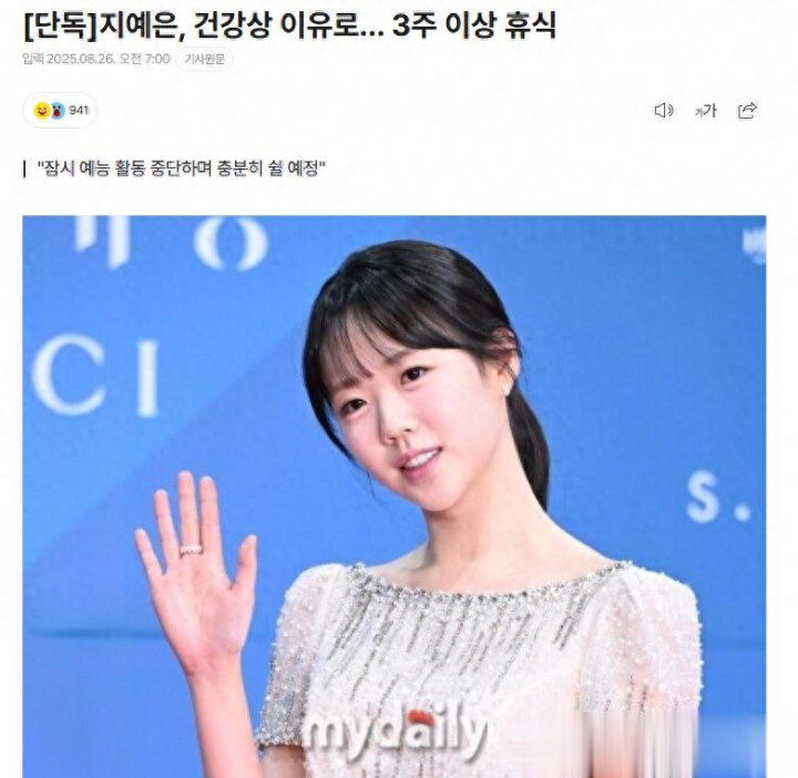 演艺界相关人士透露:“池艺恩需要短暂的休息时间”、“经过与医生充分沟通后,建议她休息,预计从9月到10月将休息3周以上”。